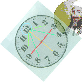 Dans un calendrier de transit le mouvement de la rotation de 5 horloges planétaires se déroule horizontalement, si bien que naît une représentation linéaire de temps. P.ex., si on prenait pour Bush (de nov. 2002 à oct. 2003) seulement les conjonctions (BLEU) de JUPiter, on aurait une image trop sucent d'une expansion. Seulement en automne il faut compter avec de nouvelles restrictions (SATurne BLEU SOLeil). Mais, si on ajoute les oppositions (JAUNE) de NEPtune, l'image devient déjà plus exacte, et peut même indiquer des tromperies possibles, des partenaires douteux, et inconsistant. Ceci s’accentue encore en juillet 2003 par le carré SATurne ROUGE NEPtune. A ce moment là, on a reproché publiquement a Bush d’avoir dénaturé intentionnellement les raisons de guerre contre l'Irak. Si on laisserait l’ordinateur interpréter automatiquement les 21 transits de Bush avec les 32 maximums, on obtiendrait qu’une série embrouillée d’énonciations avec, certes, des indications correctes, mais noyées dans l’ensemble. ▲