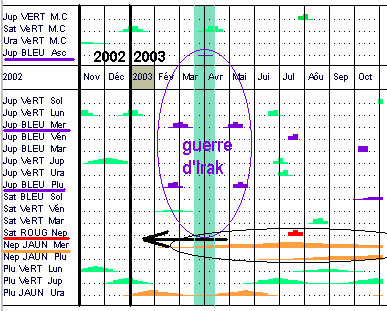 [X] Calendrier de Transit Nov. 2002 - Oct. 2003 pour le président G. W. Bush L’interprétation du calendrier en forme d’une Analyse de Temps [XX] se distingue par l'évidence visuelle, la brièveté et l’utilité personnelle par rapport à une question qu’on se pose - et non par un longue texte d'interprétation produit automatiquement par l’ordinateur.