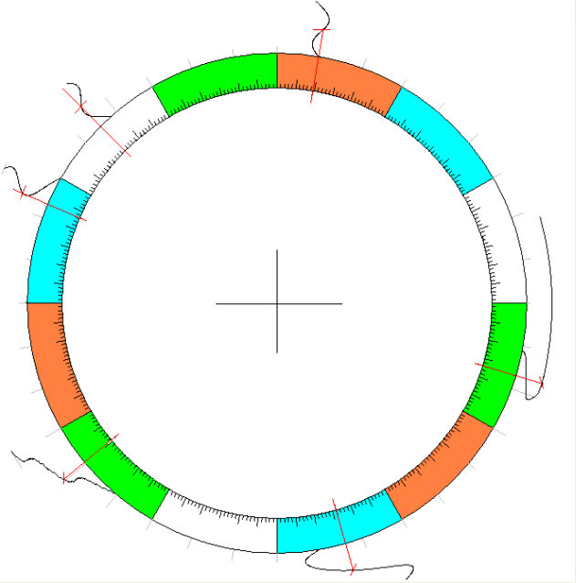 Imprimez ce cercle (paysage/portrait, marche circulaire 15mm), et indiquez les 13 positions de votre code cosmique. Ce code se compose de 10 positions planétaires et de 3 axes cosmiques (ASC, M.C, NdL) du moment de votre naissance. Les transits les plus importants se produisent lorsque des planètes ou des axes coïncident avec une courbe (dans un calendrier de transit ces tendances sont marqué en BLEU).