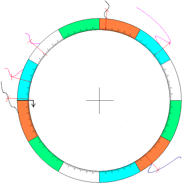 Den Kreis ausdrucken (Rand umlaufend 15mm), und darauf Ihren kosmischen Kode eintragen. Das sind 13 kosmische Positionen, die sich im Geburts-Augenblick gebildet haben: 10 Planeten-Positionen und 3 Achsen (ASZ, M.C, MKn). Die wichtigsten Transite ergeben sich, wenn eine dieser Geburts-Positionen mit einer Transit-Kurve zusammen fällt (in einem Transit-Kalender sind diese Tendenzen immer BLAU markiert).