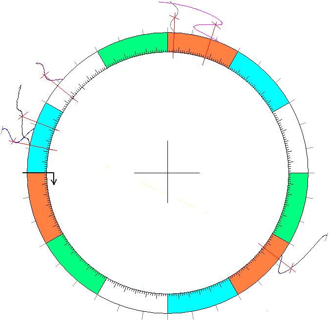 180° = Opposition (JAUNE) : Ces tensions sont celles ou la courbe planétaire se trouve en opposition à une position natale. Placez le triangle sur une courbe de transit actuelle et au centre du cercle, et examinez (en tournant un peu) ce qui se trouve en face d’une position natale. Sur une montre normale, cette situation correspondrait aux demi-heures. Des oppositions s’expriment en forme de débats (s’opposer, contredire, discuter). Les oppositions de JUPiter sont les moins problématiques. ▲ Voir une illustration/ colonne à droite [X•]?